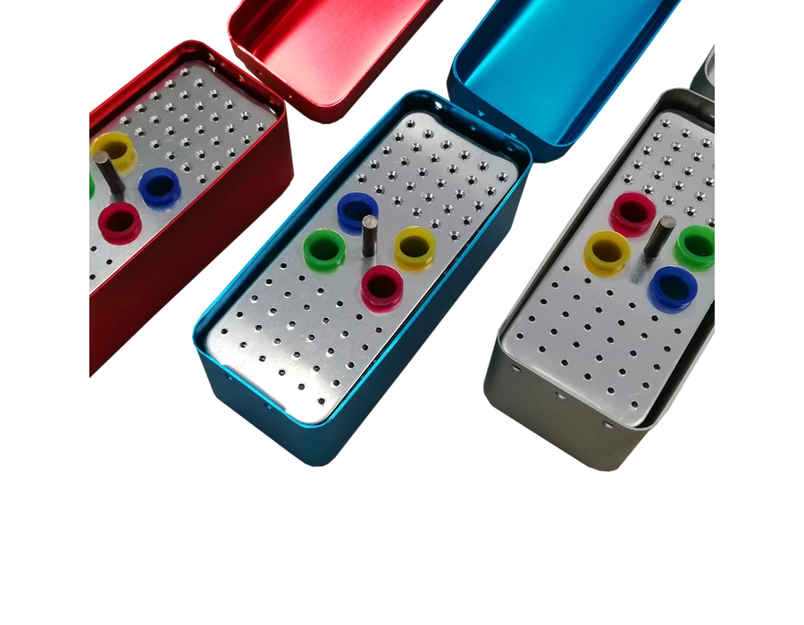 The box has 30 holes for FG drills and 30 holes for root canal drills for storage and sterilisation.