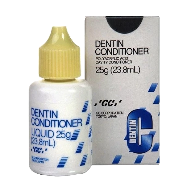 GC Dentin Conditioner is a diluted polyacrylic acid solution that removes the smear layer on the dentin and conditions the dentin, improving adhesion between the dentin and glass ionomer.