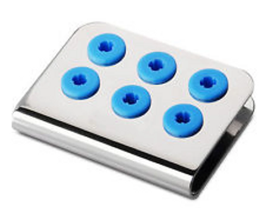 The holder holds 6 depurator heads and is autoclavable! Do not place in heat because of the rubber parts!